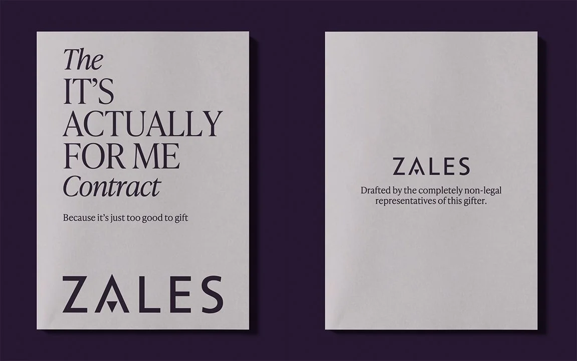 We turned the temptation to keep Zales for yourself into an official-ish document. The ‘It’s Actually For Me’ Contract meant gifters could cheekily take their jewelry back, repossession triggers included things like failing to wear it on multiple occasions, or describing the piece as “quirky,” “fun,” or “cute” instead of “absolutely life changing.” Print yours off, slip it in with your jewelry and ta-da, their gift is yours.
